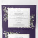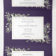 Convite de casamento triplo tudo-em-um com elegantes folhas de verdura em aquarela botânica em um fundo roxo, uma moldura dourada chique e sua foto especial. O convite inclui detalhes da informação dos convidados para a celebração e um cartão de RSVP. Projetado por Thisisnotme©