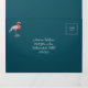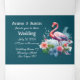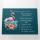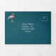Este bonito convite de casamento triplo vem em uma só peça com todas as informações em uma página. Basta cortar o cartão de resposta e enviar e-mail para a noiva. Texto branco e elementos sobre um fundo de cinza azul com Flamingos cor-de-rosa em cada parte da informação e um Flamingo na parte do endereço de origem.