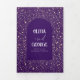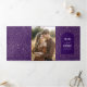 Este encantador convite de casamento roxo escuro triplo combina magistralmente fotografias pessoais com um tema celestial elegante, ideal para celebrações de temas estelares como "Sob as Estrelas", "À Lua e Volta" ou "Escrito nas Estrelas". O design une sem falhas seu convite de casamento, informações de casamento e RSVP em um conjunto na moda solteiro. Personalize cada lado com fotos idênticas ou distintas para um efeito personalizado e considere a possibilidade de adicionar uma terceira imagem à frente. Se seus planos de casamento forem abrangentes, a foto dentro do quadro do arco no dentro pode ser mudada para texto, mantendo o foco visual nas fotos da frente. Para facilitar, o RSVP pode incluir seu código QR personalizado atualizando o URL existente na ferramenta de edição. O refinado trabalho de arte inclui sutis representações de uma lua crescente ouro, uma estrela cadente vívida, planetas, constelações e galáxias - cada elemento se juntando para retratar a beleza encantadora de um céu noturno estrelado e a magia de seu romance.