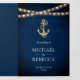 Encontrem seus convidados com esta rústica, todos em um convite de casamento com uma bela âncora de folha de ouro falso com luzes de cordas penduradas em um fundo de madeira de celeiro vintage com placa RSVP destacável. Basta adicionar os detalhes do seu evento neste modelo fácil de usar e enfeitar este cartão com a sua foto favorita para torná-lo um convite único.