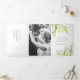 Casamentos de arte botânica Eucalyptus com convites multifunções com duas fotos. Personalize este convite de casamento para resposta destacável e dissimulável com os seus próprios detalhes da cerimônia de casamento, agenda, alojamento e outras informações, assim como opções de refeições, pedidos de música, respostas e duas das suas fotografias de casais favoritas. Outros itens de casamento correspondentes estão disponíveis. © Original watercolor eucalipto branch painting e design por Sarah Trett para www.mylittleedenweddings.com no Zazzle.