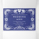 Papel picado picado amava pássaros três vezes o convite de fiesta de casamento. Esta natureza inspirou o convite de casamento floral do estilo folk mexicano inclui dois pássaros apaixonados e um coração amoroso com a palavra amor, assim como flores, folhas e pequenos pontos em fundo azul escuro, rosa quente e laranja.