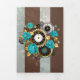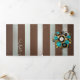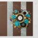 Relógio antigo e patenteado, adornado com joias, mãos de ouro e algarismos latinos com rosa de turquesa sobre fundo castanho e listrado. Estilo Steampunk.
