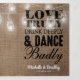 3 em 1 convite triplo de casamento de países rústicos, com um fundo de efeito de burlap castanho rústico, luzes de toque elegantes, os dizeres "EAT, DRINK AND BE MARRIED" e "AMOR VERDADEIRAMENTE, DRINK DEEPLY E DANCE BADLY". Você pode adicionar uma foto personalizada de você e seu parceiro, os detalhes do casamento, como informações de alojamento, detalhes do site, o convite, e um cartão postal rsvp para seus convidados cortarem e enviarem de volta.