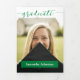Um script elegante anuncia seu graduado sobre sua foto de sênior favorita na frente. Bloco para o nome deles na frente, e todos os detalhes da cerimônia dentro, junto com mais duas fotos. Espaço na parte de trás para uma mensagem de agradecimento aos amigos e familiares. Design disponível nas cores escolares vermelho, laranja, roxo, verde, azul, laranja queimado, grená e preto. Produtos combinando disponíveis.