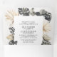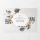 Design tropical e minimalista com ilustração de palma de praia e folhas de banana com toques ouros. Este convite sustentável, tudo em um, economizaria dinheiro, não precisaria incluir envelopes RSVP, seus convidados cortarão o último painel e enviarão para você como um cartão-postal.