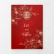 Este elegante convite de casamento chinês bilíngue apresenta um galho de arte floral de linha floral dourada magnolia e um símbolo de dupla felicidade dourada num fundo vermelho brilhante. Nomes de noiva e noivo em um elegante roteiro escrito à mão. Convite para casamento chinês ou convite para cerimônia de chá. Com um texto tradicional chinês no lado médio e os detalhes e um código qr digitalizável para o seu site de casamento no lado direito.