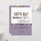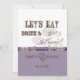 Fontes elegantes e divertidas anunciam a mensagem, "Vamos coma, beba e se case!" em um maravilhoso e caprichoso Concurso de Casamento. Em uma paleta de cores clara, nítida, lavanda, púrpura de ameixa, castanha de chocolate e branca, é o melhor da safra com uma torção moderna. O lado da frente tem a mensagem e os seus nomes com a data do casamento. No verso estão os ornamentos de duas impressoras com uma letra elegante caligráfica à mão e o texto "Celebrar conosco" em fontes únicas e divertidas, juntamente com as suas informações de convite para casamento. Há um conjunto completo de produtos disponíveis com este design e podemos fazer isso em qualquer combinação de cores que você desejar.