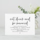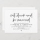 Coma, Beba e seja casado, tema moderno de design minimalista, cartão de convite para janto de ensaio de casamento (em caracteres pretos e você pode facilmente mudar a cor da fonte). Planejar uma celebração do Janto de ensaio do casamento com a futura noiva e futura noiva, antes do seu grande dia? Convide os convidados com este Cartão de Convite para Janto de Ensaio de Casamento perfeito. Adicione os detalhes do janto de ensaio em letra/letra correspondente.