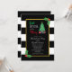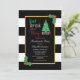 Coma, beba e seja feliz convite de festa de solteira de Natal com uma árvore de Natal e presentes contra uma estrutura de ouro. Fundo listrado a preto e branco com holocre