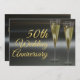 Este convite de aniversário de 50 anos de casamento apresenta duas taças de champanhe na capa e detalhes no verso em um fundo preto. Preencha os campos de texto do modelo com suas informações, remova o texto ou clique em personalizar para escolher um estilo, tamanho e cor de letra que preferir.