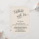 Este cartão versátil e elegante foi projetado para convidar seus amigos e familiares para o seu jantar de recepção ou festa realizada algum tempo após a própria cerimônia de casamento. A base é um fundo sólido que pode ser alterado para qualquer cor que você desejar. Usando uma fonte de letra cursiva moderna e fluida, criei um gráfico de tipografia simples que diz "Celebre Conosco" com belos arabescos e curvas. A mesma fonte foi usada para criar a palavra "amor", que foi colocada, bem grande, no verso. Use os campos de modelo fornecidos para atualizar o design. Se você quiser personalizar ainda mais, movendo quaisquer detalhes para outro lugar, alterando as fontes ou tamanhos dos detalhes, basta clicar no link fornecido e editar o design como desejar. Adicionei todas as camadas separadamente e elas estão desbloqueadas para lhe dar total controle sobre o design. // 98 //