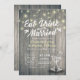 Comece a beber e a casar-se com Modelos de Cartões de Celebração de Casamento - Letras Elegantes, Óculos de Champanhe Vintage e Luzes de Cordas no Fundo Russo da Madeira. Um Design Perfeito Para O Seu Grande Dia! Todo Estilo De Texto, Cores, Tamanhos Podem Ser Modificados Para Ajustado Das Suas Necessidades.