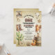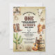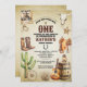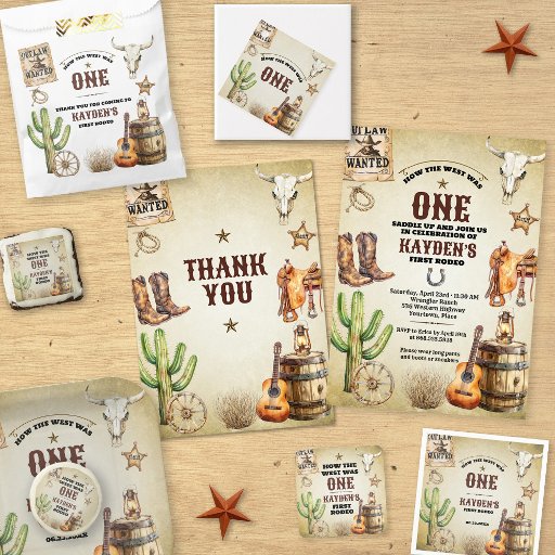 Junte-se aos seus convidados para uma divertida festa de aniversário de vaqueiro do estilo ocidental. Um pergaminho de meteorologia mostra elementos de uma perfeita festa de aniversário de rodeio, incluindo um cacto, guitarra, roda de vagão, botas de cowboy, sela, tumbleweed e muito mais! Os ornamentos do estilo ocidental decoram o convite para criar um tema único para uma primeira festa de aniversário de aniversário ou outra idade. Disponível com produtos correspondentes.
