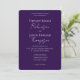 Em um sólido fundo roxo, este convite de casamento consiste num tema elegante, mas minimalista. A fonte do script contemporâneo, fica no meio do convite, enquanto um texto sans serif constitui o resto do convite. A parte traseira da placa é um fundo de vazio roxo.