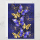 Composição de borboletas luxuosas de safira e joias de ouro em fundo azul texturizado.