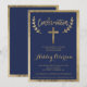 Tipografia de ouro falsa elegante azul marinho com confirmação de cruz dourada com borda geométrica dourada. Um convite moderno para festas de batismo com esta tipografia moderna, simples, elegante e chique de pincel de ouro amarelo falso sobre um fundo azul marinho. Perfeito para festa simples, elegante e moderna. Se precisar de algum texto alterado e personalizado não hesite em contactar-me!
