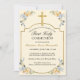 Celebre a Primeira Comunhão da sua filha com amigos e família convidando-os com esta elegante carta de convite da Primeira Comunhão de Ouro Sagrada. Este design apresenta uma bela cruz ouro com uma trama de ouro contra um fundo amarelo macio com flores de aquarela com pêssego e azul em cada canto. Personalize o texto e a fonte ao seu gosto. Outras fontes e estilos disponíveis.