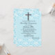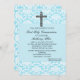 Comece a comemorar com este convite elegante, mas delicado, para aqueles rapazes especiais da Santa Comunhão. Ele tem um damask azul no topo e na parte inferior do convite. No topo do centro há uma cruz de damask preto e branco. Veja os muitos outros itens nesta linha, como etiquetas, postagens, notas de agradecimento e muito mais.