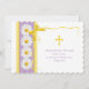 O texto sobre este convite da Santa Primeira Comunhão, roxo, amarelo, branco e margarida, é perfeitamente personalizável. Para alterar o texto, use a opção personalizar. Para alterações de texto mais abrangentes, incluindo alterações na fonte, no tamanho da fonte, na cor do texto ou no layout do texto, use a opção personalizar. Você também pode alterar a cor de fundo usando personalizá-la. Este convite é, atualmente, personalizado como um convite sagrado da Primeira Comunidade, mas poderia também ser utilizado para outras ocasiões especiais cristãs ou católicas, como a confirmação. Apenas mude o texto. Bonito e alegre para primavera ou verão. A cruz no verso pode ser removida se você desejar usá-la.
