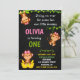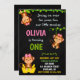 Convite de aniversário de macacos Convite de primeiro aniversario de menina Um convite para a festa da selva. Este pequeno convite para macacos tem um fundo escuro, três meninas macaquinhas em lianas e bananas. Vamos a uma festa da selva! Uma comemoração selvagem com estilo macaco! Simplesmente edite este modelo fácil de usar e altere todos os textos para torná-lo especial.