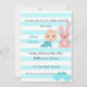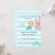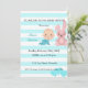 Um convite para chá de fraldas, design com coelho, flores, linhas brancas e azuis e balões.