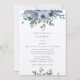 Um belo convite de casamento floral azul empoeirado com flores de aquarela, texto de cinza da Noiva e do Groom com seus pais.