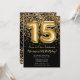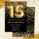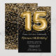 Convite de aniversário preto e 15 de ouro elegante para uma menina de 15 anos com script elegante escrevendo fontes douradas e balões de folha divertida.