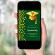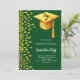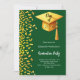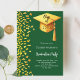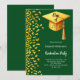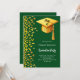Um convite moderno e elegante para a Festa de formatura. Um fundo verde esmeralda decorado com confete dourado falso e um boné de formatura grande com tassel. Personalize e adicione um nome e detalhes da parte. Texto branco.