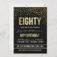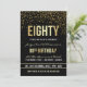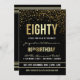 Este convite de aniversário octogésimo formal, elegante, na moda, moderno é apropriado para homens ou mulheres. Compreende linhas limpas douradas, o roteiro gótico caixa à moda e o texto fixo sofisticado da folha de ouro do falso em um fundo preto com os chás do confete sparkling, cintilante do ouro e das flâmulas do partido. O texto foi projetado ser tão simples como possível personalizar e Zazzle tem uma grande variedade de carácteres tipo diferentes a escolher de. Note por favor que todos os convites de Zazzle são plano impresso e que a folha e os confetes do brilho são efeitos digitais.