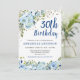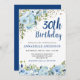 aniversário de 30 anos Blue Floral Watercolor Dourado Confetti Invitation O design apresenta belos azuis e florais verdes.