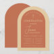 Um convite de confirmação moderno com arco, terracota e creme, gênero neutro. Na parte superior há uma cruz com texto em arco acima dela. O primeiro nome é escrito em letra cursiva, acima do segundo nome. As informações da cerimônia e do recebimento estão em duas colunas separadas por uma linha. O texto, as linhas e a cor do arco externo são creme, o fundo (o arco interno) e a parte de trás são marrom terracota.