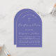 Um convite de confirmação simples e moderno em forma de arco. Tem apenas texto branco sobre fundo violeta. Na parte superior há uma cruz com texto arqueado acima dela. A ocasião e o nome são escritos à mão.