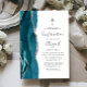 A borda esquerda deste elegante convite de confirmação moderno apresenta uma cor azul-lacrimejante agata borda cortada com falso brilho prateado. Uma cruz de folha prateada falsa aparece acima do texto personalizável, que combina escrita manual, chapa e fontes itálicas em cinzas de carvão em um fundo branco. O verso apresenta um design de cor azul e agata prateado correspondentes.