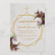 Este elegante desenho religioso floral recomendado para a confirmação de uma menina tem uma moldura dourada geométrica irregular com ramalhetes de peônias vermelhas burgundy e brancas para cima e para baixo sobre dois hexágonos dourados que se sobrepõem, com uma cruz dourada no topo. O fundo é de mármore branco. O nome da criança é escrito em uma elegante fonte caligráfica; o resto é escrito em maiúsculas. Todo o texto tem uma cor amarelo-dourada, como a moldura dourada.