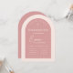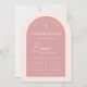 Um convite de confirmação de menina moderno com arco, rosa corado e rosa velado. Na parte superior há uma cruz com texto arqueado acima dela. O primeiro nome é escrito em letra cursiva, acima do segundo nome. As informações da cerimônia e do recebimento estão em duas colunas separadas por uma linha. O texto, as linhas e a cor do arco externo são rosa corado, o fundo (o interior do arco) e a parte de trás são rosa velado, uma tonalidade moderna de rosa