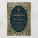 Este elegante convite de confirmação com ar vintage tem um quadro de ouro vintage com folhas de ouro espiraladas decorações em um fundo azul marinho escuro. O texto é dentro e oval com ouro e tem uma cruz de ouro sobre ele. O nome do garoto está escrito em um roteiro caligráfico elegante. Todo texto pode ser personalizado e tem uma cor de ouro semelhante à decoração dourada do quadro. No verso, há as mesmas folhas de ouro decorações e um oval menor com uma cruz de ouro no centro. O pano de fundo com suas elegantes folhas de ouro em azul-marinho é de uma ligação de cobrir do livro vintage, de T. J. Cobden-Sanderson (1840-1922), para A Capital de Karl Marx; publicada em 1884, agora no dominio público. O livro pertencia ao artista William Morris.