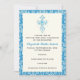 Damask First Holly Communion / Baptism / Convite de confirmação, com borda azul damasco e uma elegante cruz azul sobre fundo marfim. Um convite religioso moderno para o evento tradicional da Primeira Comunhão, adequado para rapazes e raparigas. Pode ser utilizado em várias ocasiões, tais como Baptismo/Christening ou Confirmação.