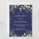 Um fundo azul marinho decorado com verde de eucalipto e folhas de ouro e faíscas de brilho dourado. Uma cruz ouro. Personalize e o nome e a cerimônia da criança. Fundo: fundo azul marinho.