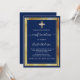 Um moderno, elegante e convite. Um fundo azul marinho decorado com uma cruz ouro e quadros de ouro falsos. Personalize e adicione um nome e detalhes. Texto branco.