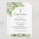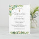 Convite de confirmação Elegante com detalhes florais elegantes de cor aquosa verde e elementos caligráficos modernos escritos à mão, tanto na frente como no verso. Sexo Convite neutro, ideal para confirmação de menina ou de garoto. Voltar com o quadro do estilo do logotipo moderno do canto com o nome e a data de confirmação do seu filho. Folhagem verde e flores numa bela mistura de cinzas verdes, brancas, amarelas e douradas. Estilo elegante, moderno e fresco.
