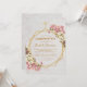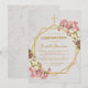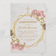 Este elegante convite de confirmação floral tem uma estrutura irregular de ouro com buquês de flores de orquídeas brancas e rosa para cima e para baixo sobre dois hexágonos de ouro que se sobrepõem a um fundo de mármore branco, com uma cruz de ouro no topo. O nome da criança é escrito em um roteiro caligráfico elegante. Todo texto tem uma cor amarela ouro, como o quadro dourado. O buquê de flores com orquídeas cor-de-rosa e brancas é de um cartão postal antigo de Bertha Maguire (1862-1910), agora no dominio público.