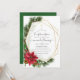 Trendy rustic christmas sip e veja convite com moldura geométrica dourada e tipografia elegante com sinos de trenó, flores de poinsettia, sagrada, névoa e pinheiro.