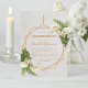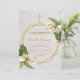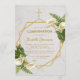 Este convite de confirmação floral elegante tem uma moldura irregular dourada com ramalhetes de copos-brancos e feto para cima e para baixo sobre dois hexágonos dourados que se sobrepõem a um fundo de mármore branco, com uma cruz dourada no topo. O nome da criança é escrito em uma fonte caligráfica elegante. Todo o texto tem uma cor dourada, como a moldura dourada.