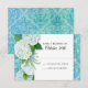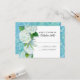Com arte original pintada à mão e desenhada graficamente por Audrey Jeanne. Cartão de resposta de confirmação de presença para convites de casamento. Criado em estilo vintage, mas com arte recém-criada de espirais de damasco em tons de azul, desde aqua até azul celeste. Flores de hortênsia brancas caem ao longo da borda do painel lateral do design. Direitos autorais, Audrey Jeanne Roberts.