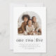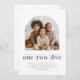 Um moderno convite conjunto de Aniversário que apresenta a sua própria fotografia em forma de arco e 3 seções para o nome e a idade de cada criança.