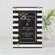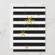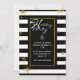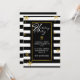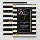 Na moda, convite de férias moderno feito em um padrão de stripe horizontal preto e branco. Gráficos de flocos de neve com aspecto dourado decoram o fundo, e uma área de texto preto com borda dourada tem texto branco lendo Felizes Feriados, no estilo da tipografia. Personalize o texto branco da sua festa de feriado. Os produtos correspondentes estão disponíveis.