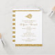Estes convites elegantes fazem um verdadeiro salto com sotaques dourados brilhantes, uma concha de ouro, e listras douradas clássicas, ousadas e brilhantes no verso. Personalize o texto do convite para atender às suas necessidades. Um design perfeito para uma celebração temática náutica.