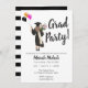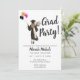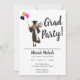 Ilustrações de graduação em aquarela com menina de vestido de graduação segurando balões e buquê floral. Modelos de texto editáveis para adicionar seus próprios detalhes.