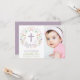 Este elegante e bonito batismo, batizante convite apresenta uma coroa floral ilustrada com a palavra "batismo" em torno de uma cruz. O lado direito da placa inclui uma área de fotos personalizável. A cor do texto, a fonte e a mensagem podem ser alteradas para seu gosto. A parte de trás do convite apresenta um fundo roxo (que pode ser trocado para qualquer cor da sua escolha) com um padrão quatrefoil branco.